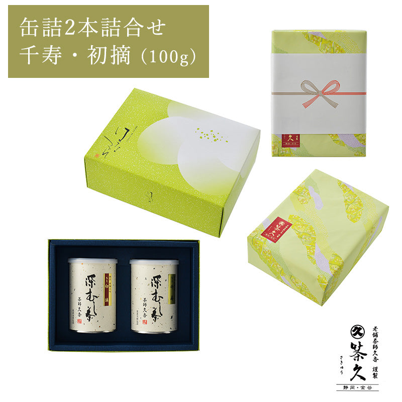 高級品の千寿、一番人気初摘の2種類の詰合せ。幼い新芽を摘んで大事に大事に丁寧に仕上げした逸品です。100g缶詰でご体裁も良くお茶好きな方へのご贈答にぜひどうぞ。